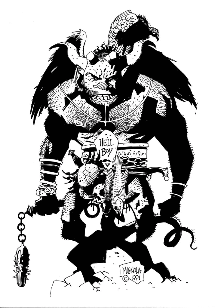 When Mike Mignola started drawing Hellboy his characters and art were far more detailed than today. He still used shadow to create form but relied on more grey tones and textures.